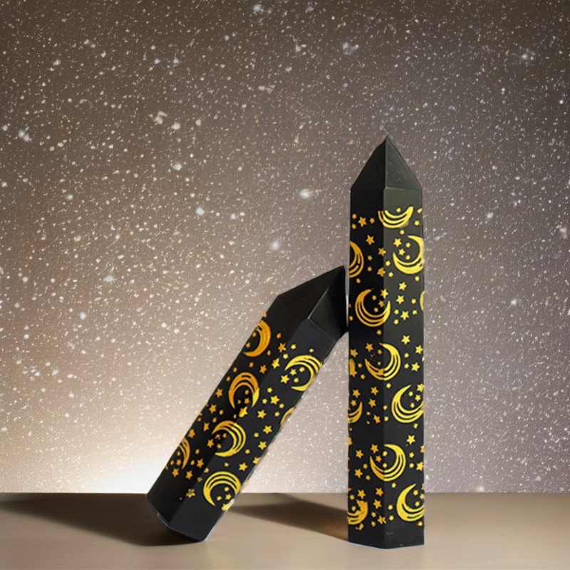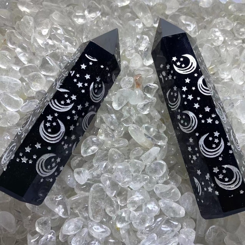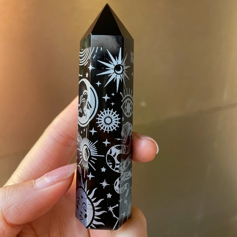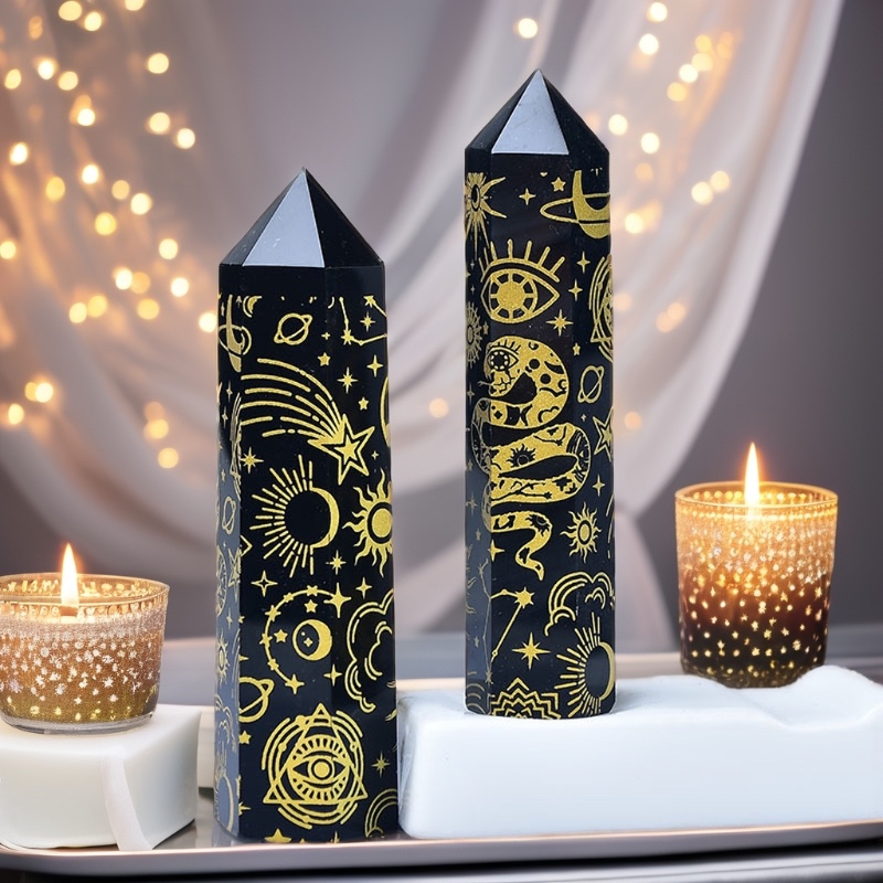 Product Name | Natural Quartz Wands 6cm 7cm Feng Shui Tower Stone Carved Printing Black Obsidian Tower Animal Themed Home Decor for Gifts |